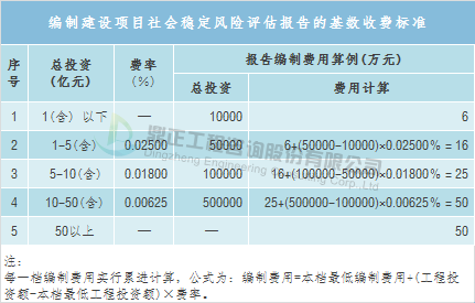 按照上述調整系數對建設項目社會穩定風險評估咨詢服務收費進行調整后,編制建設項目社會穩定風險評估報告的收費低于6萬元的,按6萬元計取,高于50萬元的按50萬元計取;評價建設項目社會穩定風險評估報告的收費低于4萬元的,按4萬元計取,高于25萬元的,按25萬元計取。