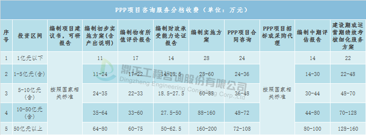 PPP項目咨詢服務取費可參考地方收費標準,如廣東省工程咨詢協會《關于印發PPP項目咨詢服務收費參考(試行)的通知》(粵咨協〔2016〕28號)、四川省推進政府和社會資本合作研究會《關于印發四川省PPP項目咨詢服務收費標準的通知》(川政資研發〔2018〕2號)。