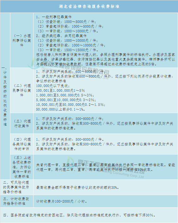 法律咨詢服務取費可參考地方收費標準,如湖北省地方標準——《湖北省物價局、湖北省司法廳關于印發<湖北省律師服務收費管理實施辦法(暫行)>的通知》(鄂價房服〔2006〕258號),具體如下: