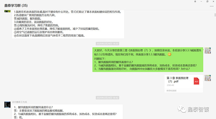 居家辦公期間不能忽視專業知識的學習。基于微信平臺建立學習群,由專人負責網上分享鍍鋅專業知識,并進行網上問答互動。